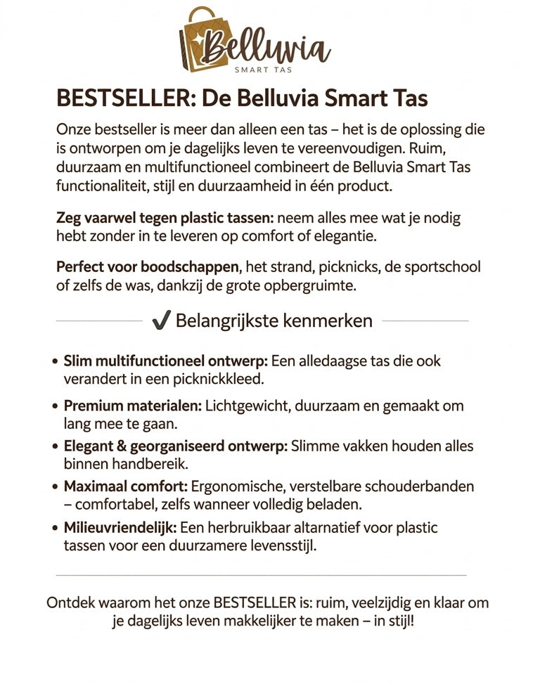 Elke Belluvia-tas is ontworpen om comfortabel en veelzijdig te zijn – perfect voor boodschappen, werk of een dagje onderweg. Met onze tas hoef je niet langer meerdere tassen mee te nemen – alles past netjes in één georganiseerde tas, zonder gedoe.