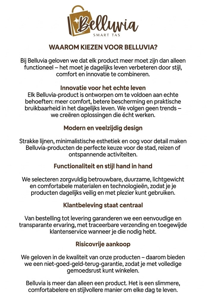 Belluvia is ontstaan uit een klein, gepassioneerd team dat houdt van functioneel design en dagelijkse eenvoud. Ons doel is een tas te creëren die praktisch, duurzaam en stijlvol is, en je helpt de dagelijkse uitdagingen gemakkelijker te maken.