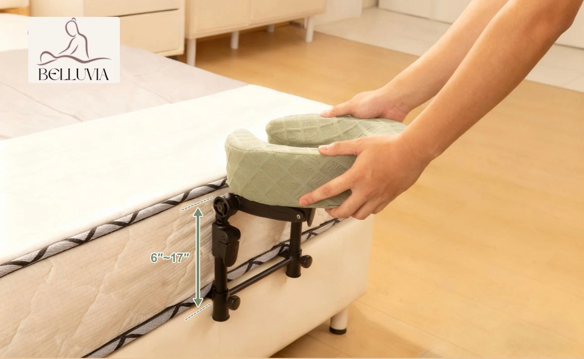 The Belluvia Massage Face Cradle slides effortlessly under your mattress, instantly creating stable and ergonomic support for your head — just like a professional massage table.